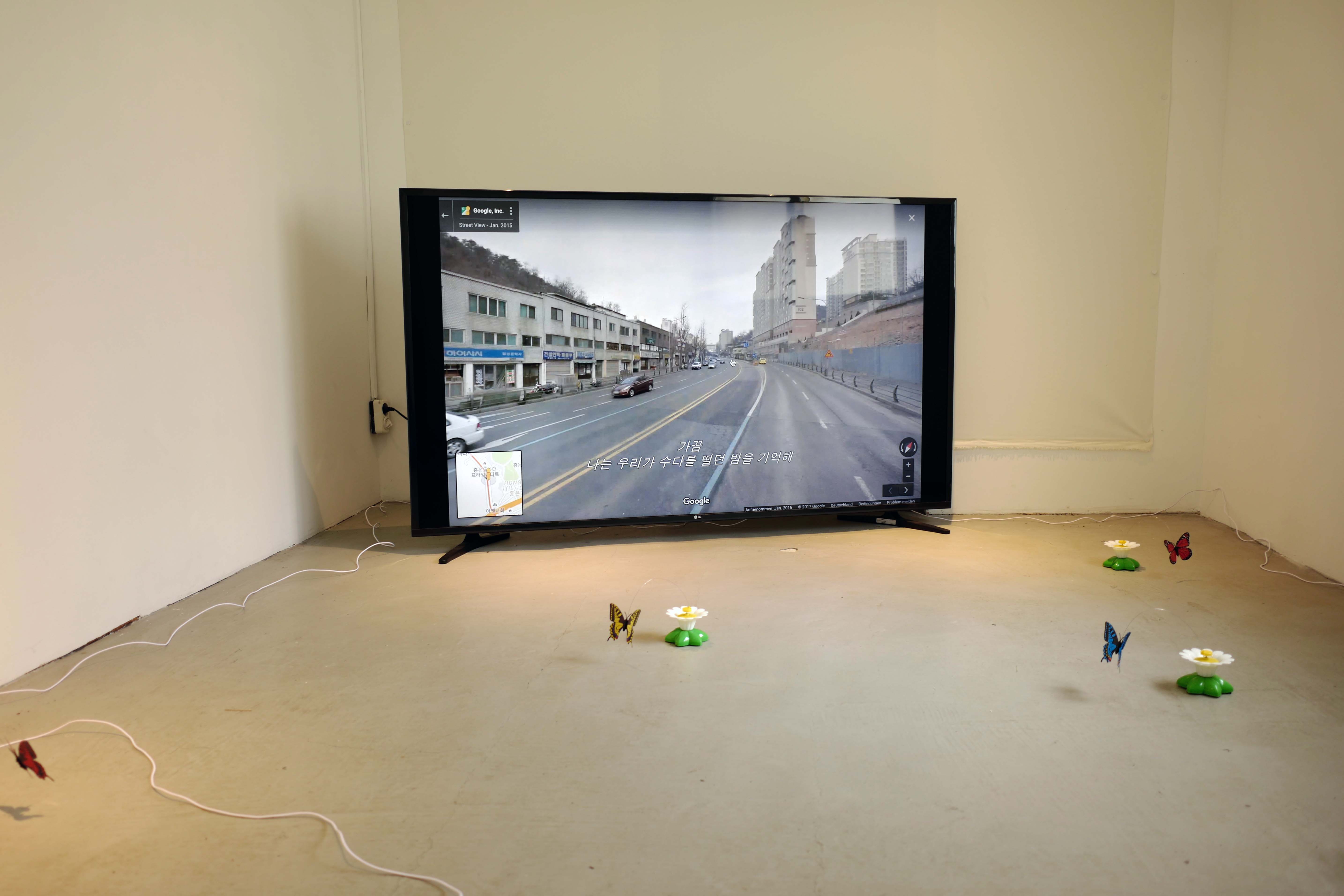 다시 전시계획도 안으로 돌아온다. 위에서 내려다볼 때, 엽서 크기의 실내 도면은 외려 평면의 전개도처럼 파악된다. 임의의 선들로 대체된 기둥과 벽면을 따라 접으면 복잡하고 입체적인 부피의 구조물이 돌연 조립될 것 같은 모양새다. 그렇게 원래는 아무것도 없었던 ‘제주시 거로남 6길 13’이라는 가상의 주소지에 문화공간 양이 지어지고, 실제 축척의 지형과 풍경이 형성되며, 실제로 초대받는 과정에서 현실의 어디쯤을 점유하게 되는 것이다. 수직 시점의 실내 도면은 노지露地로서 열려있고, 그 안을 습기처럼 배회하는 동안 마침내 <체조하기> 속 노란 티셔츠 뒷면에 인쇄된 문장은 ‘평화야 고치글라’로 확인된다.