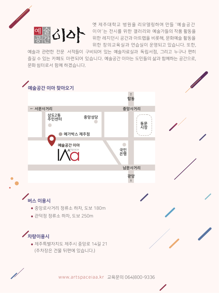 - 주소 (63169) 제주특별자치도 제주시 중앙로14길 21 예술공간 이아