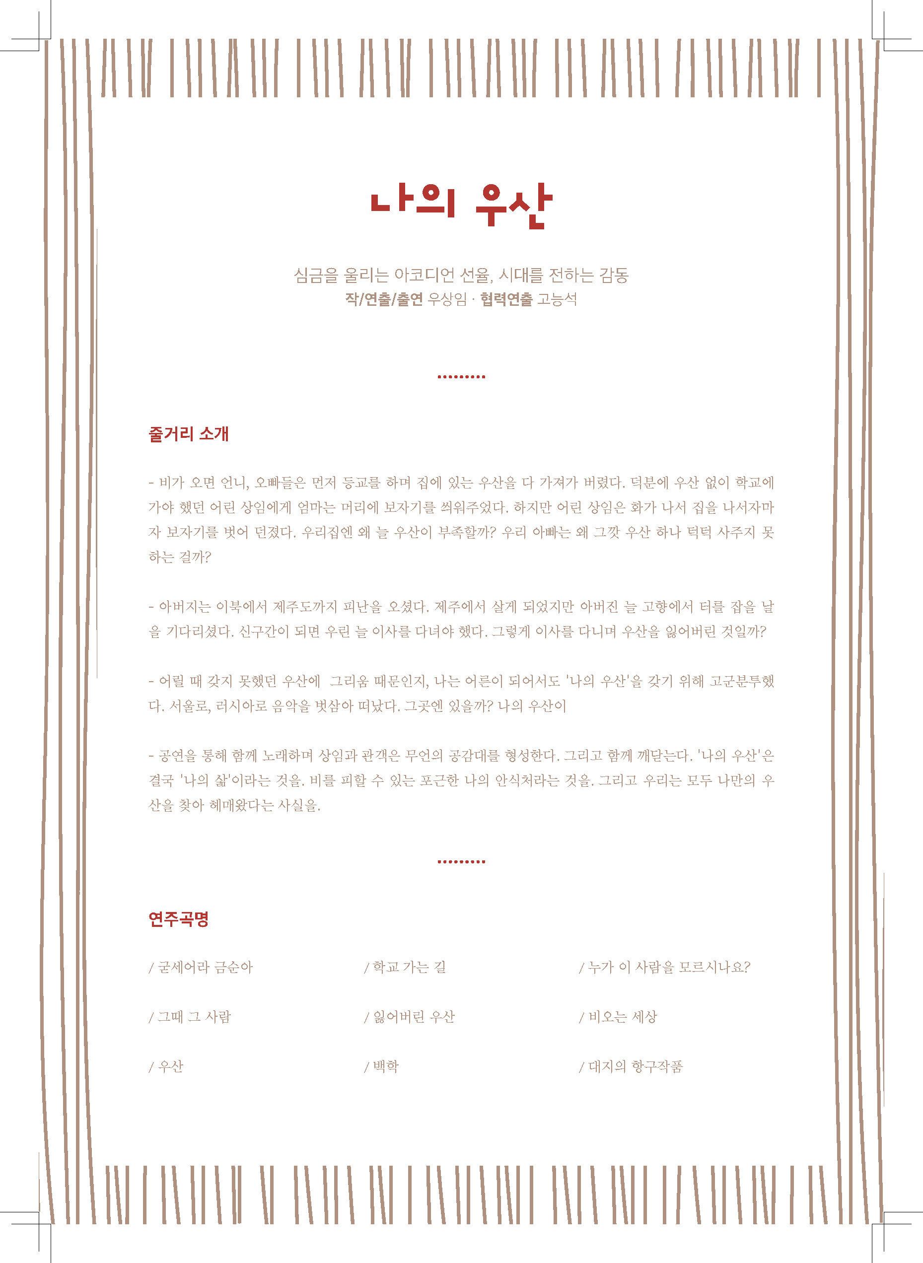방방곡곡 다양한 공연현장에서 '나만의 우산'을 전파하고자 합니다.