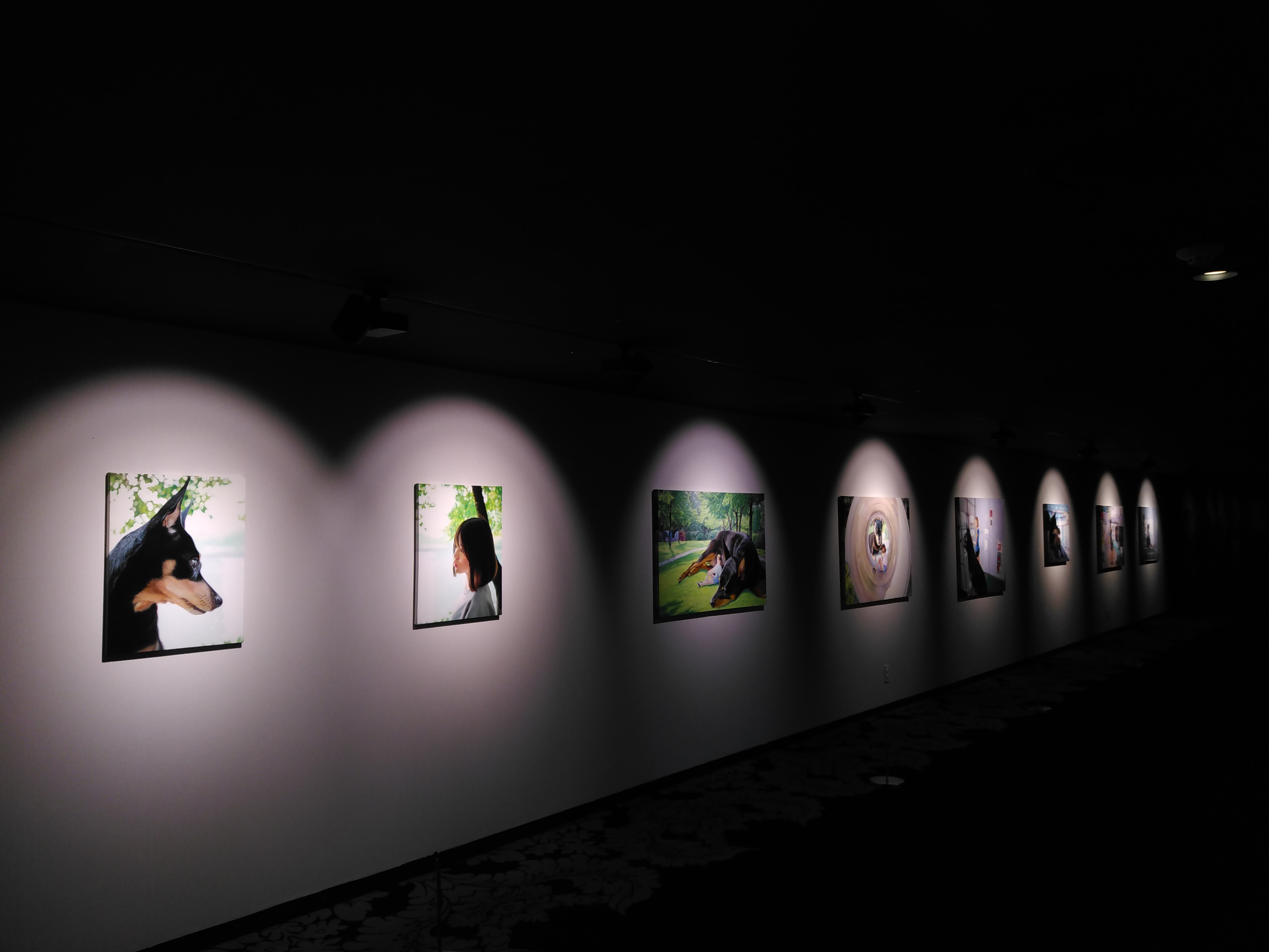 ‘애완동물’에서 ‘반려동물’로 표기해야 한다는 움직임이 최근 들어 뚜렷하게 나타나고 있다. 과거 사람에게 즐거움을 주는 대상의 취급에서 더불어 살아가는 하나의 존재로 인식의 전환이 일어 난 것이다. 집을 지키던 동물에서 같이 살아가는 대상으로 역할의 변화가 일어나며 서로의 관계에 대하여 관심을 가지게 된다. 변화된 역할의 경험이 누적되며 유대감이 각자에게 생성되었다. 정우재 작가는 바로 그 관계성에서 비롯된 그들이 주는 위로에 주목한다. 방황하는 혹은 불안정한 우리의 모습을 사춘기 소녀에 대입하고 보통의 공간 속에 소녀를 위치시켜 일상성을 강조하였다. 그리고 자신의 반려 견 또한 앞서 담아낸 풍경과 동일한 빛의 환경을 조성하여 촬영 후 두 이미지를 합성하여 에스키스를 만들어 낸다. 이렇게 섬세한 과정을 통하여 그려진 작품은 렌즈 특유의 빛 느낌을 사진처럼 잘 재현해 낸다. ‘사진’이란 있는 그대로를 빛으로 그려 재현해 낸다는 인식이 있으며 그렇기 때문에 ‘사진 같다’라는 것은 극 사실주의적 이라고 정의 내릴 수 있다. 작가가 사진 같아 보이는 시각에 더욱 힘을 쏟은 이유는 현실과 판타지의 미묘한 지점을 살려내기 위함이다. 이 미묘함을 극대화 시키는 것이 바로 반려 견의 크기다. 거대화시켜 판타지적 감정을 자극시키는데 작가에 따르면 이는 초월적 대상 그리고 정서적 안정감의 상징성을 극대화 시켰다고 이야기한다. 유대감을 통해 사람이 느낄 반려 견의 크기는 어쩌면 작가가 그려낸 그 모습보다도 더 크게 느껴질 것이다.