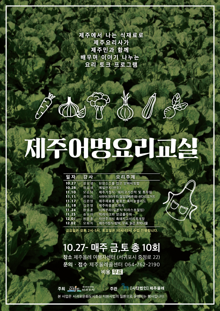 서귀포문화도시조성 지원사업의 일환으로 진행되는 이번 프로그램은, 뛰어난 손맛을 자랑하는 제주 지역 주민과 셰프 등이 제주 농수산물을주재료로 한 제주 요리 시연을 펼치며, 제주 음식에 담긴 제주 문화에 대해 참가자들과 이야기를 나눕니다.