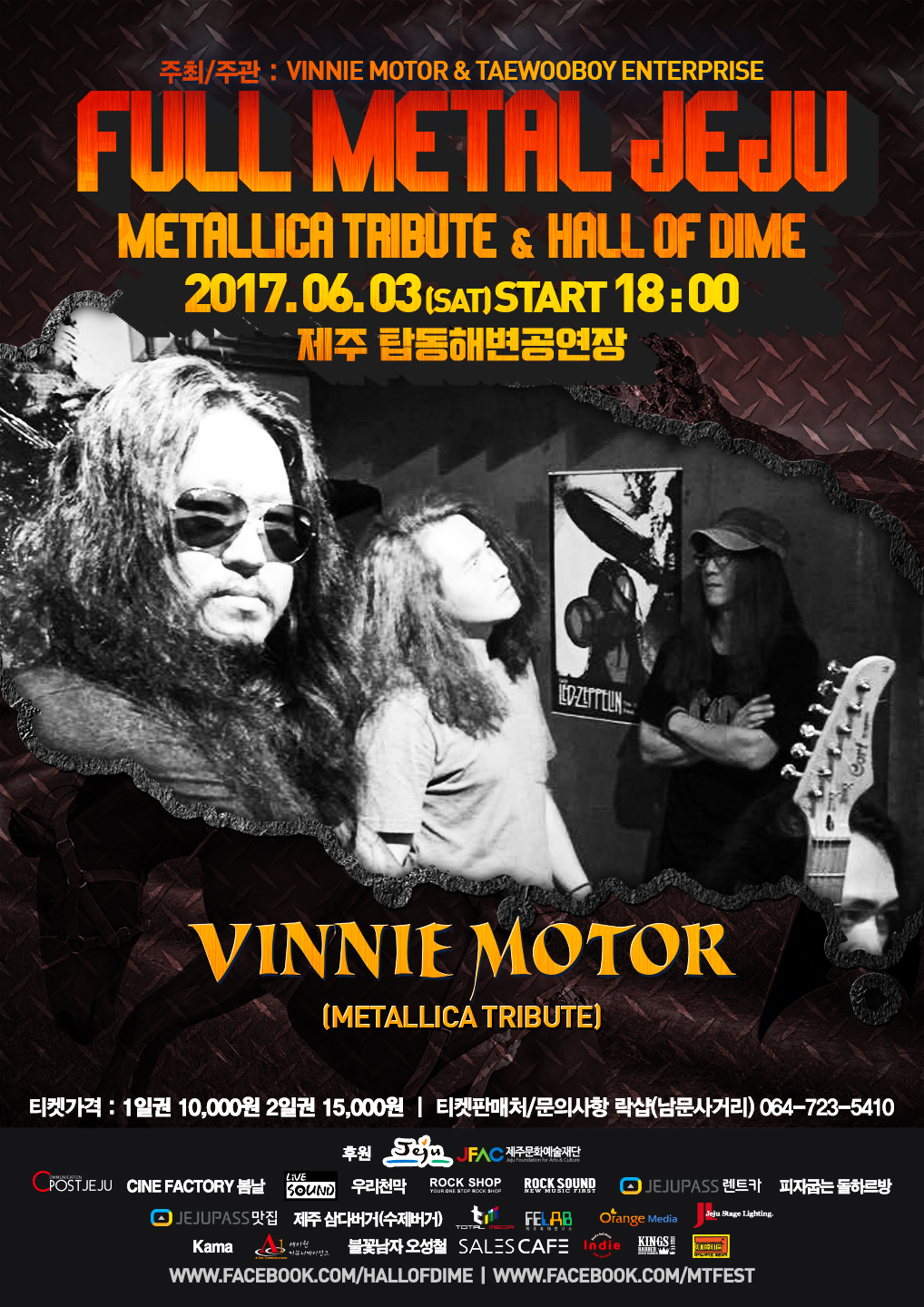 Vinnie Motor and TAEWOOBOY Enterprise are co-hosting the 6th Hall of Dime under the title of “FULL METAL JEJU” at Tabdong Beach Stage, Jeju City on 3rd & 4th June 2017. This significant concert will be brought you by Jeju Special Self-governing Province and Jeju Foundation for Arts & Culture.