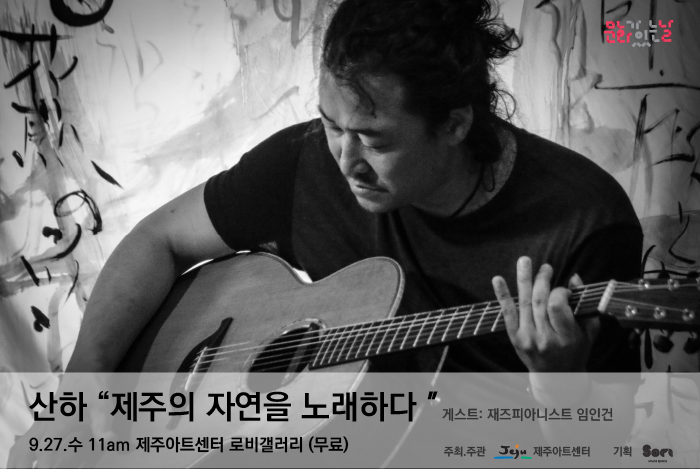 이번 기타 연주를 들려줄 산하((山下, 산아래)는 20여년간 오페라 무대디자이너로 활동하다가 2015년 하나음악 솔루션을 통해 1집 [달 한가 한] 기타솔로 앨범을 발표하며 데뷔하였다. 대부분 창작곡을 혼자 연주하는 핑거스타일형 기타리스트로서 자연 친화적인 소재와 철학적 주제를 여백과 공명을 강조하여 연주한다. 2014년 제주로 이주하였고, 주로 소극장, 카페나 하우스콘서트, 축제 등을 통해 연주하거나, 창작집단(청정점수, 소리 명상적 음악회)을 기획하여 발표하기도 한다. 현재 제주 애월에 거주하며 창작 활동과 2집을 준비 중이다.