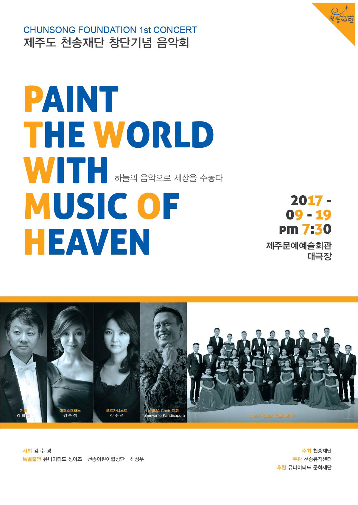 제주도 음악재단법인 천송재단의 창립기념음악회가 2017년 9월 19일 화요일 오후 7시 30분에 문예회관 대극장에서 열립니다. 제주도민 여러분들의 많은 관심과 참석을 부탁드립니다.