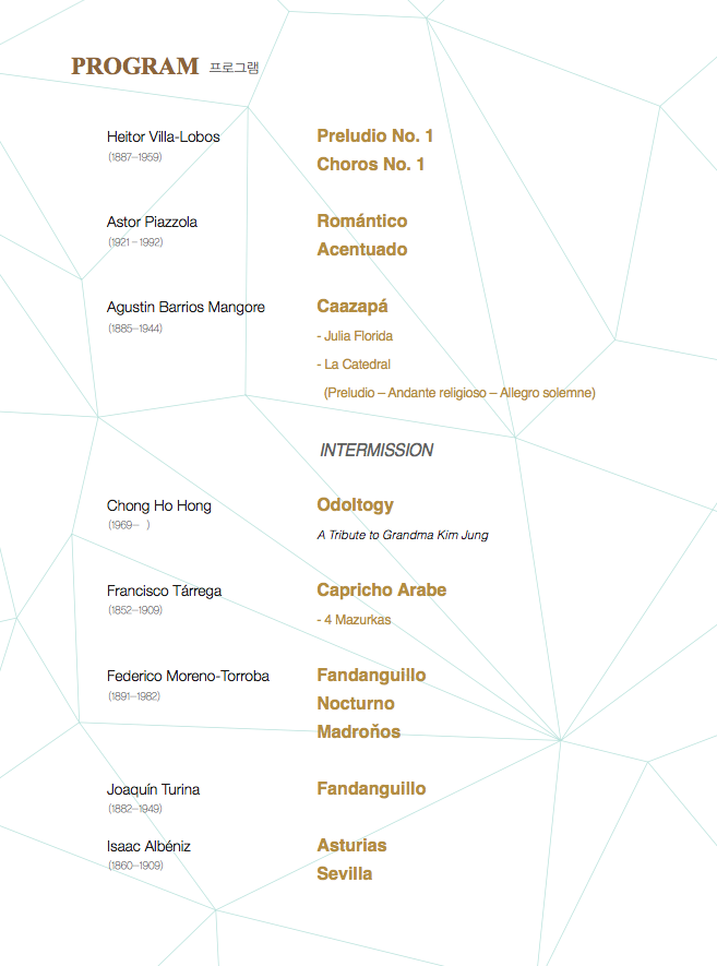 제주공연을 준비하며 바로크시대부터 20세기까지 3세기에 걸친 다양한 레퍼토리를 연주할 계획이며 홍정호의 [기타를 위한 오돌또기]는 김정문화회관의 설립 기부자이신 김정 할머니께 헌정된다.