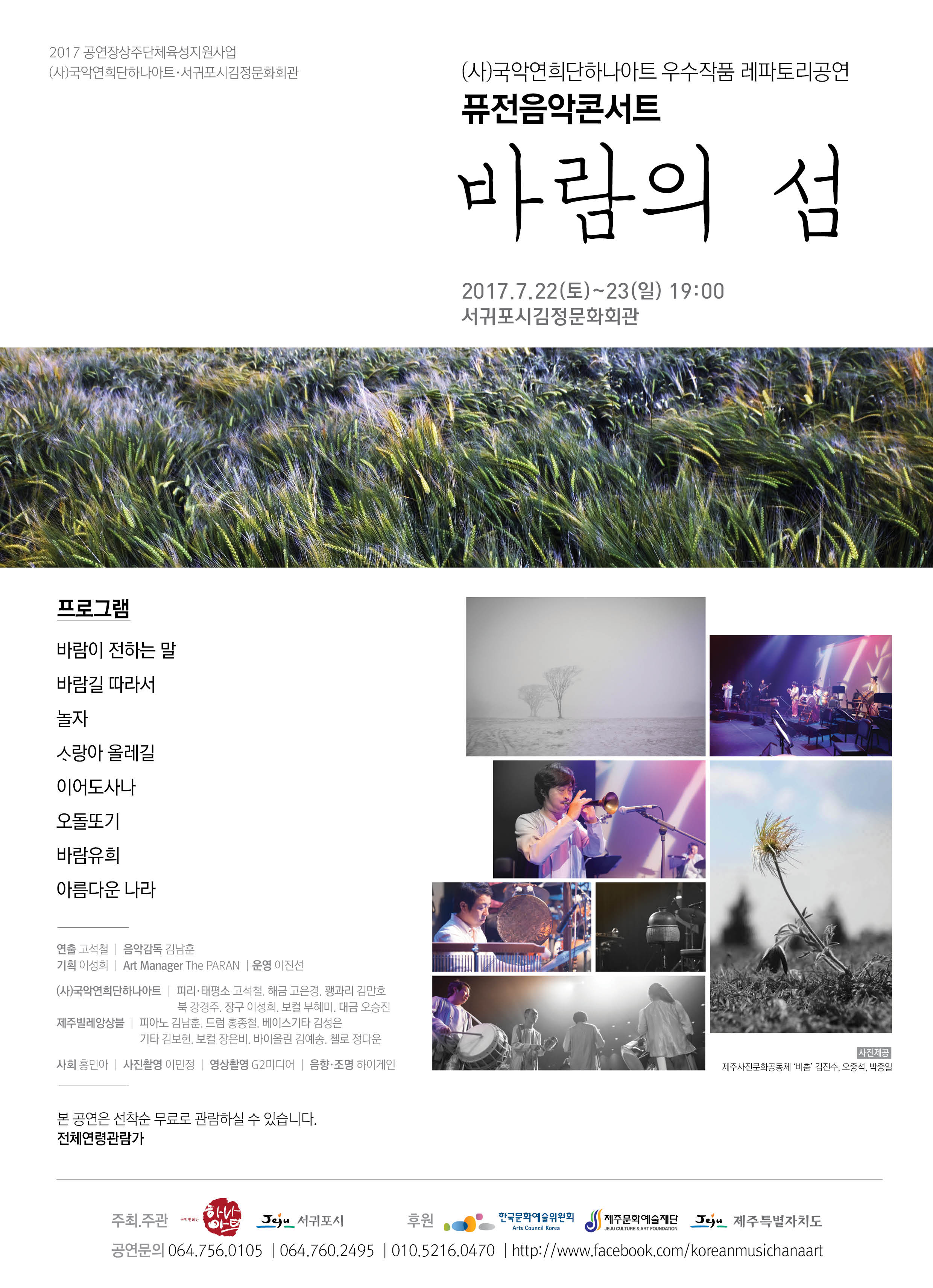 2017 공연장상주단체인 (사)국악연희단하나아트와 서귀포시 김정문화회관의 공동기획으로 퓨전음악콘서트 바람의 섬을 개최한다. 퓨전음악콘서트 바람의 섬은 국악연희단하나아트와 제주빌레앙상블의 콜라보 공연으로 제주의 바람, 제주의 이야기를 서정적이면서 신명나는 연주로 다채로움을 선사 하게 될 것이다.