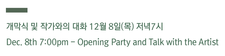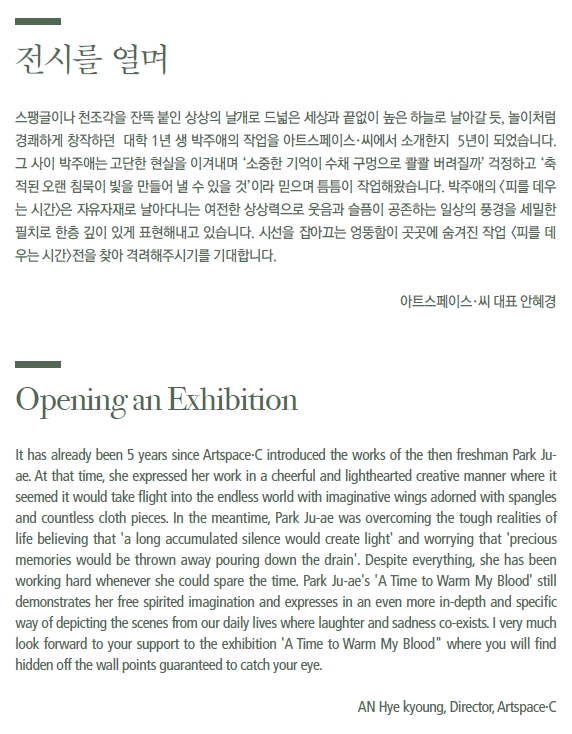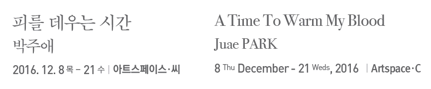 작가는 이번 전시의 제목을 ‘피를 데우는 시간’이라고 정했다. 생명이 유지되는 동안 우리의 심장은 뜀박질을 지속하며, 피를 데우며 흐르게 한다. 그 피의 온도가 외부 환경의 그것과 같아지는 순간은 아마도 생의 시간이 종료된 뒤일 것이다. 아마도 청춘의 시절 가운데 머무르고 있는 작가에게는 아직도 생의 에너지가 충만한 듯하다. 고로 그녀에게 ‘피를 데우는 시간’은 불안과 두려움 가운데서도 불길과도 같은 생 안에 자신을 던지는 시간일 것이고, 그림을 그리는 시간일 것이다. 그 시간이 그녀의 작품 안에 더욱 많은 고랑을 만들어내어, 그 안에서 이 세상에서 소멸한 것들을 다시금 살려내는 사건을 만들어내게 되기를 바란다.